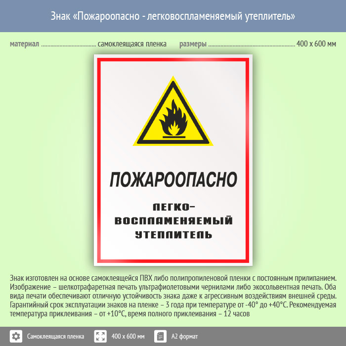 Знак «Пожароопасно - легковоспламеняемый утеплитель», КЗ-68 (пленка, 400х600 мм) в Магнитогорске купить