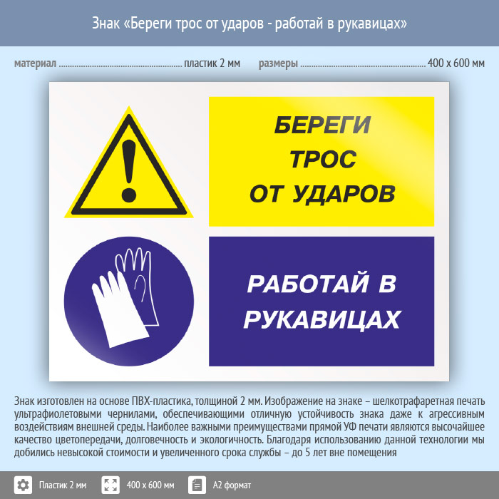 Знак «Береги трос от ударов - работай в рукавицах», КЗ-03 (пластик, 600х400 мм) в Магнитогорске купить