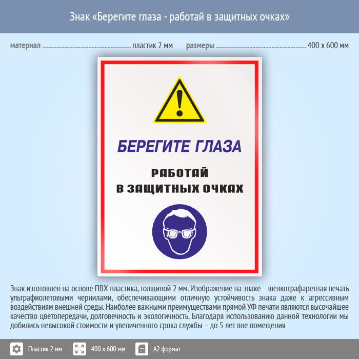 Знак «Берегите глаза - работай в защитных очках», КЗ-04 (пластик, 400х600 мм) в Магнитогорске купить