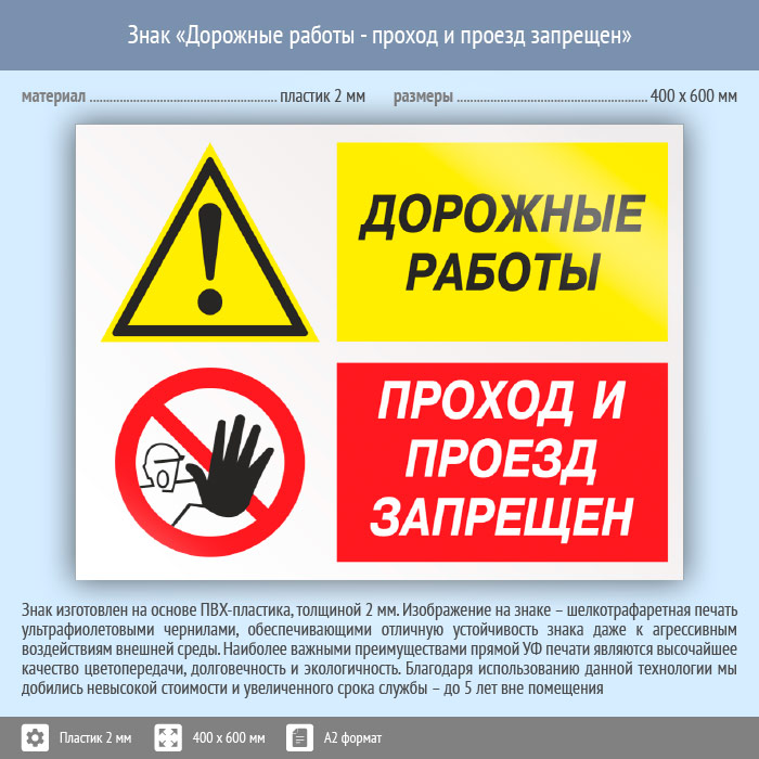 Знак «Дорожные работы - проход и проезд запрещен», КЗ-20 (пластик, 600х400 мм) в Магнитогорске купить