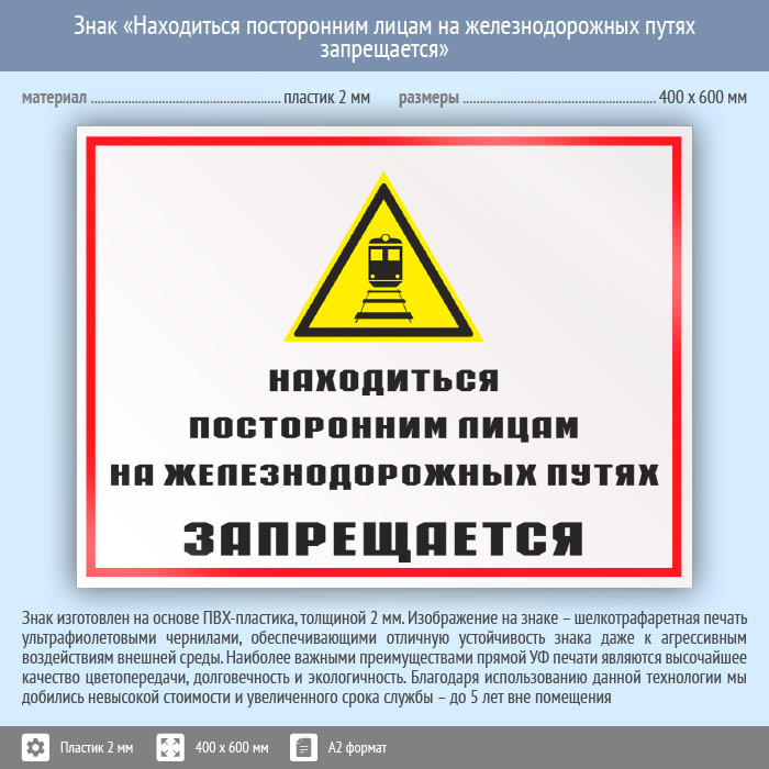 Знак «Находиться посторонним лицам на железнодорожных путях запрещается», КЗ-24 (пластик, 600х400 мм) в Магнитогорске купить