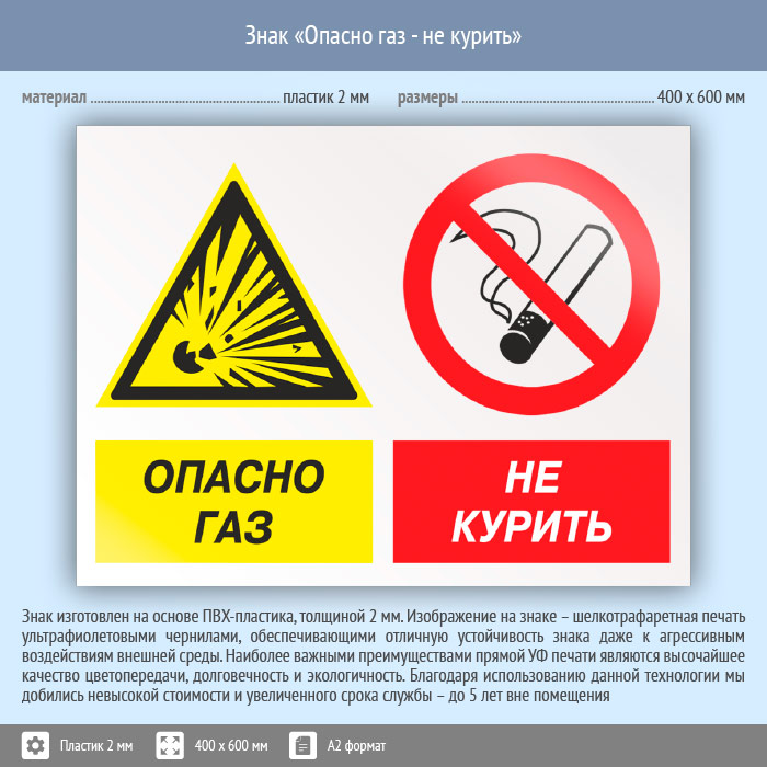 Знак «Опасно газ - не курить», КЗ-44 (пластик, 600х400 мм) в Магнитогорске купить