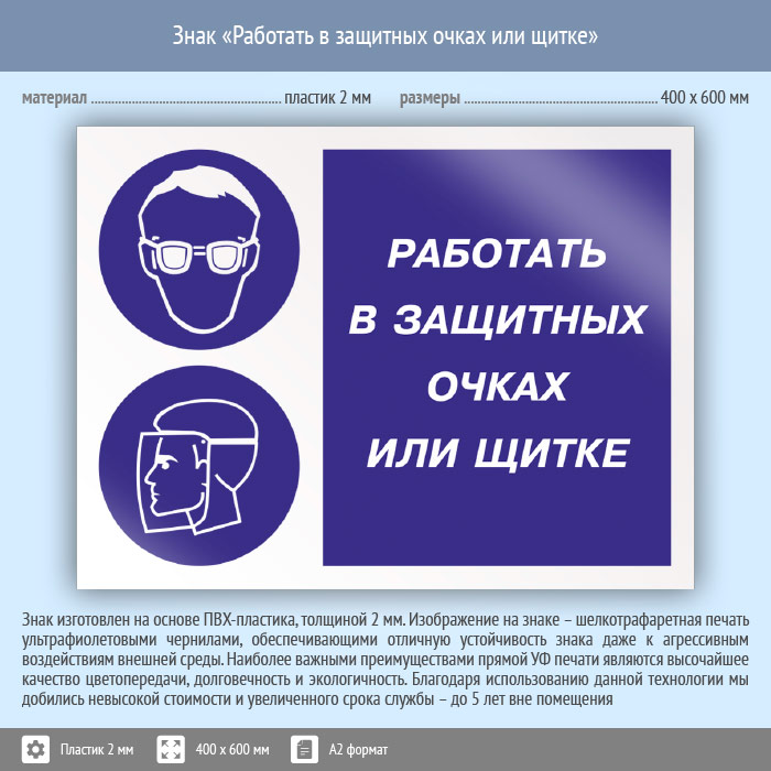 Знак «Работать в защитных очках или щитке», КЗ-80 (пластик, 600х400 мм) в Магнитогорске купить
