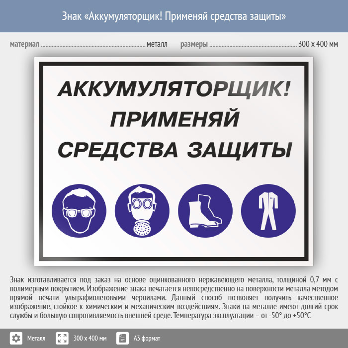 Знак «Аккумуляторщик! Применяй средства защиты», КЗ-02 (металл, 400х300 мм) в Магнитогорске купить