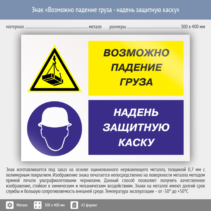 Знак «Возможно падение груза - надень защитную каску», КЗ-17 (металл, 400х300 мм) в Магнитогорске купить
