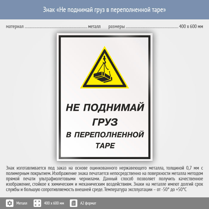 Знак «Не поднимай груз в переполненной таре», КЗ-26 (металл, 400х600 мм) в Магнитогорске купить