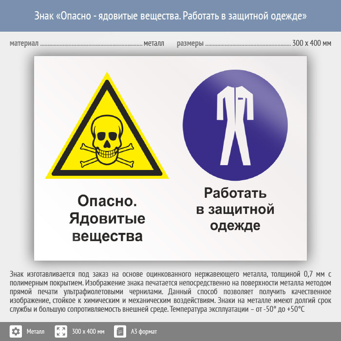 Знак «Опасно - ядовитые вещества. Работать в защитной одежде», КЗ-42 (металл, 400х300 мм) в Магнитогорске купить