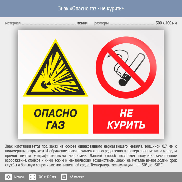 Знак «Опасно газ - не курить», КЗ-44 (металл, 400х300 мм) в Магнитогорске купить