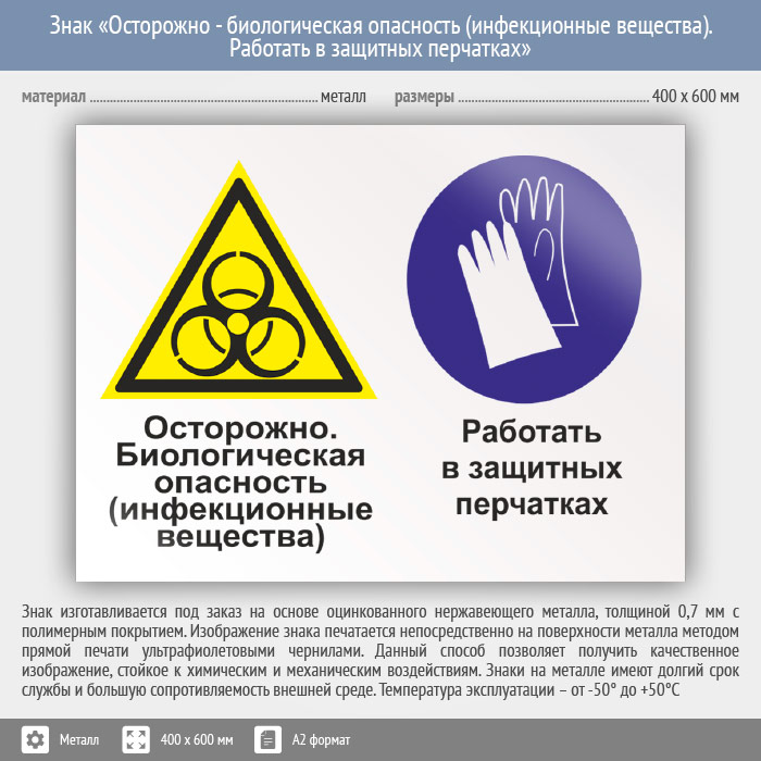 Знак «Осторожно - биологическая опасность (инфекционные вещества). Работать в защитных перчатках», КЗ-52 (металл, 600х400 мм) в Магнитогорске купить