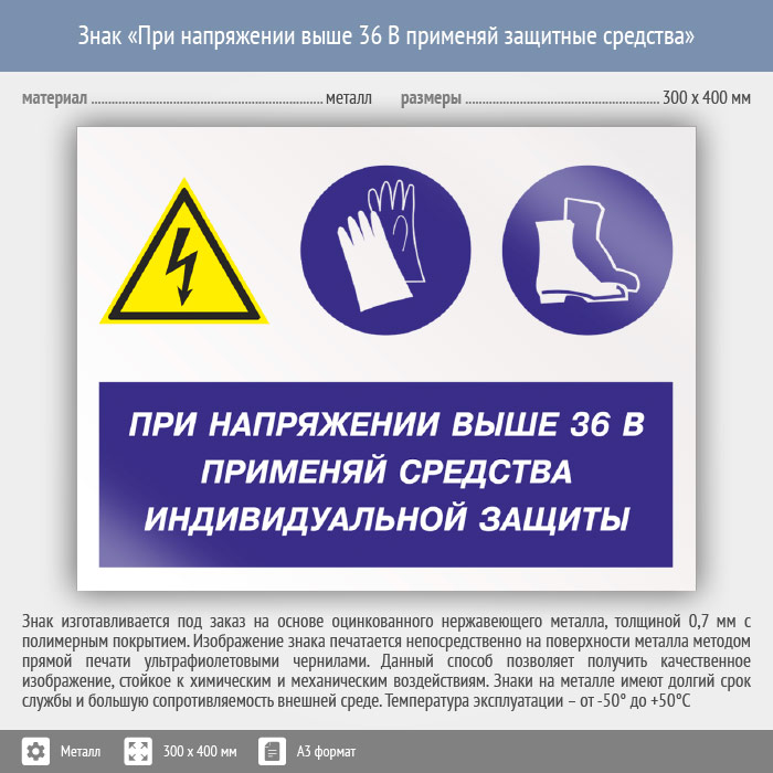 Знак «При напряжении выше 36 В применяй защитные средства», КЗ-71 (металл, 400х300 мм) в Магнитогорске купить