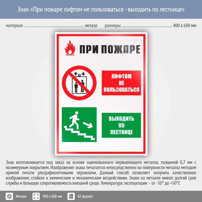 Знак «При пожаре лифтом не пользоваться - выходить по лестнице», КЗ-73 (металл, 400х600 мм) в Магнитогорске купить