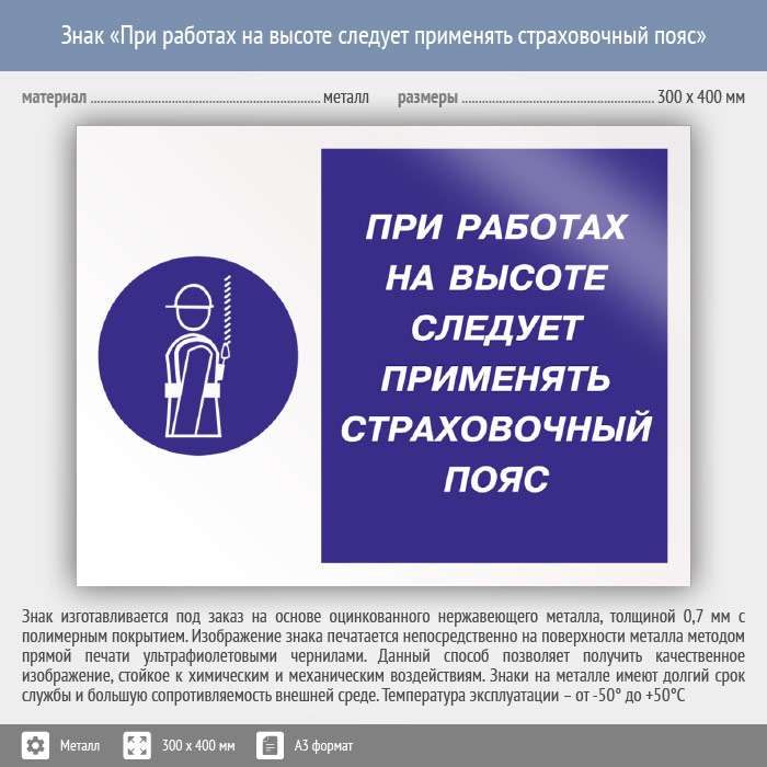 Знак «При работах на высоте следует применять страховочный пояс», КЗ-75 (металл, 400х300 мм) в Магнитогорске купить
