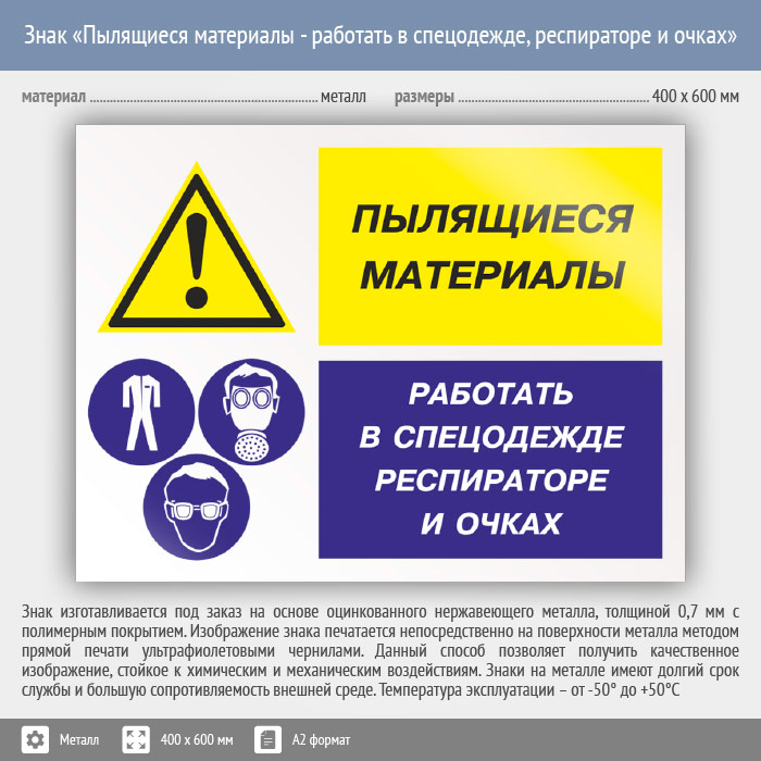 Знак «Пылящиеся материалы - работать в спецодежде, респираторе и очках», КЗ-79 (металл, 600х400 мм) в Магнитогорске купить