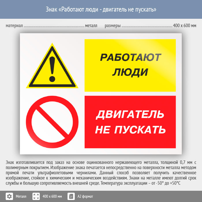 Знак «Работают люди - двигатель не пускать», КЗ-82 (металл, 600х400 мм) в Магнитогорске купить