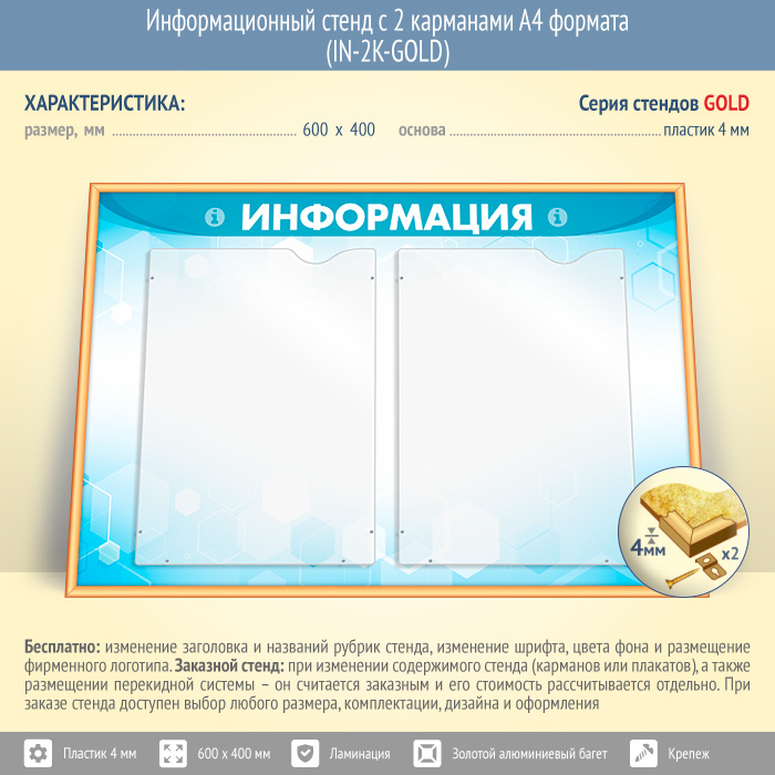 Информационный стенд с 2 карманами А4 формата (IN-2K-GOLD) в Магнитогорске купить