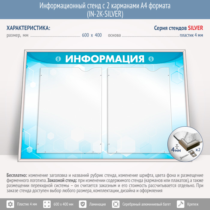 Информационный стенд с 2 карманами А4 формата (IN-2K-SILVER) в Магнитогорске купить