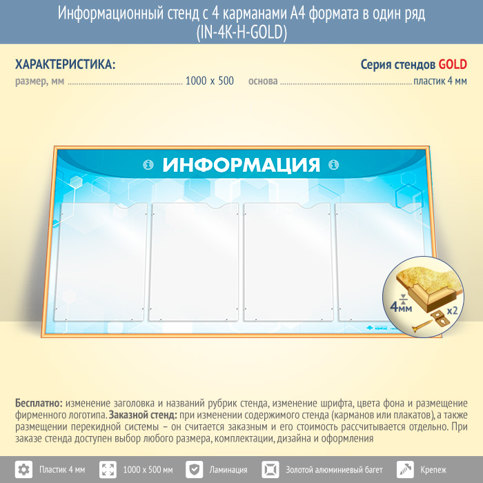 Информационный стенд с 4 карманами А4 формата в один ряд (IN-4K-H-GOLD) в Магнитогорске купить