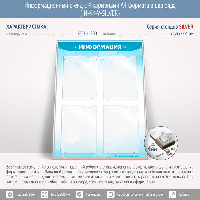 Информационный стенд с 4 карманами А4 формата в два ряда (IN-4K-V-SILVER) в Магнитогорске купить