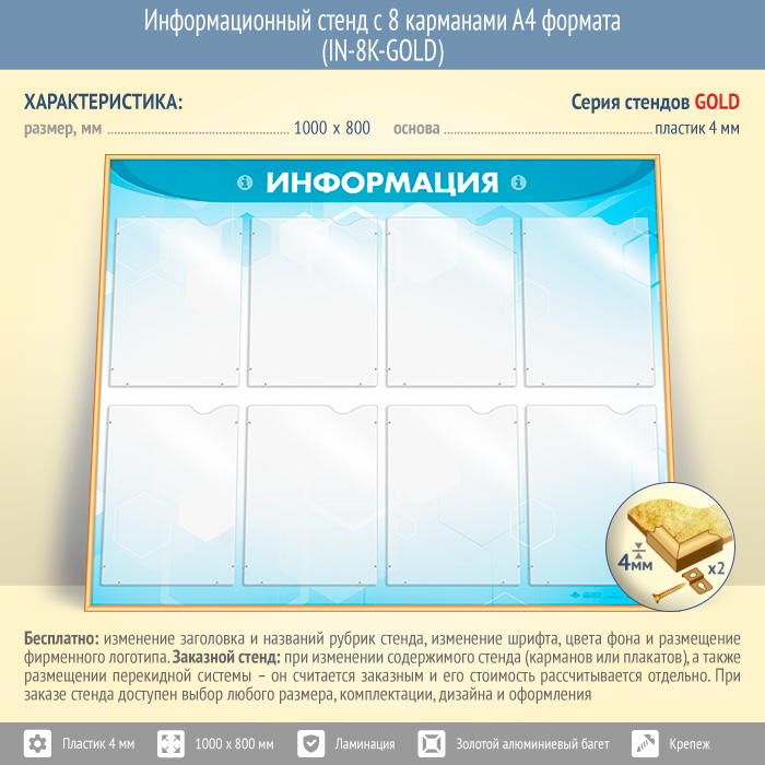 Информационный стенд с 8 карманами А4 формата (IN-8K-GOLD) в Магнитогорске купить