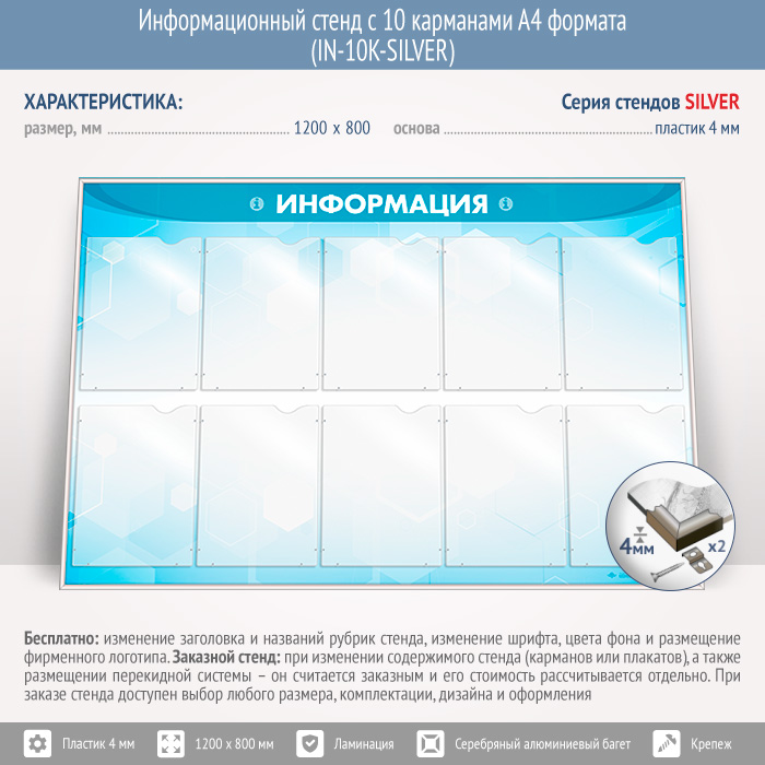 Информационный стенд с 10 карманами А4 формата (IN-10K-SILVER) в Магнитогорске купить