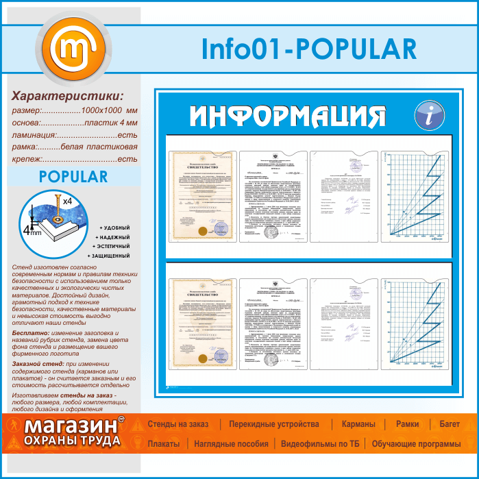 Стенд «Информация» с 8 карманами А4 формата (IN-01-POPULAR) в Магнитогорске купить