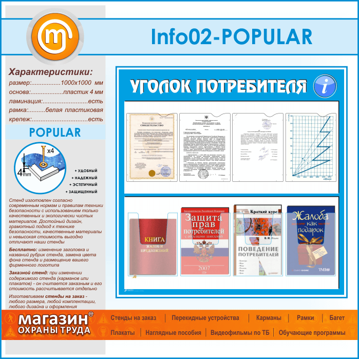 Стенд «Уголок потребителя» с 4 плоскими и 4 объемными карманами А4 формата (IN-02-POPULAR) в Магнитогорске купить