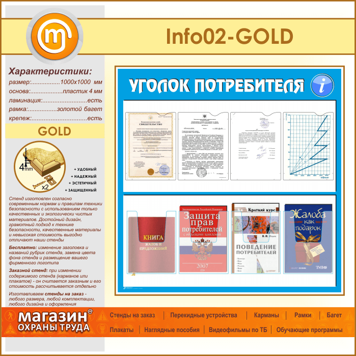Стенд «Уголок потребителя» с 4 плоскими и 4 объемными карманами А4 формата (IN-02-GOLD) в Магнитогорске купить