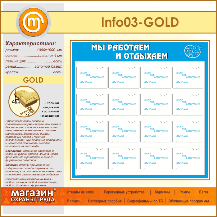 Стенд «Мы работаем и отдыхаем» с 16 карманами А5 формата (IN-03-GOLD) в Магнитогорске купить