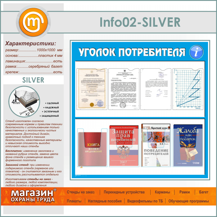 Стенд «Уголок потребителя» с 4 плоскими и 4 объемными карманами А4 формата (IN-02-SILVER) в Магнитогорске купить