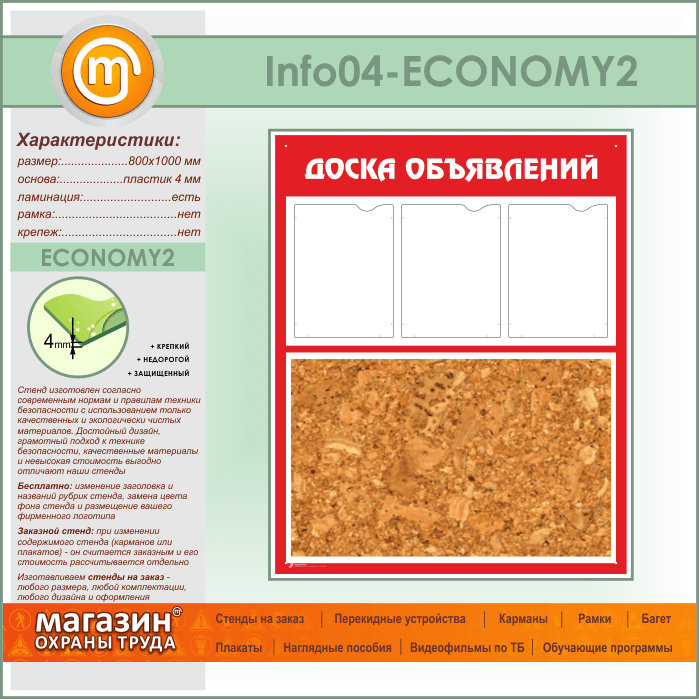 Стенд «Доска объявлений» с пробковым полотном и 3 карманами А4 формата (IN-04-ECONOMY2) в Магнитогорске купить