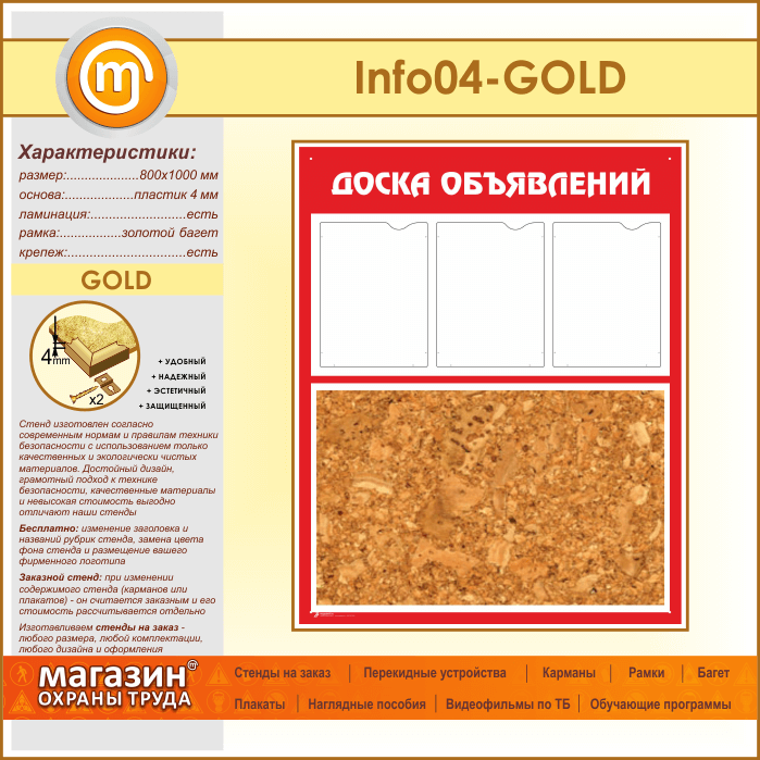 Стенд «Доска объявлений» с пробковым полотном и 3 карманами А4 формата (IN-04-GOLD) в Магнитогорске купить