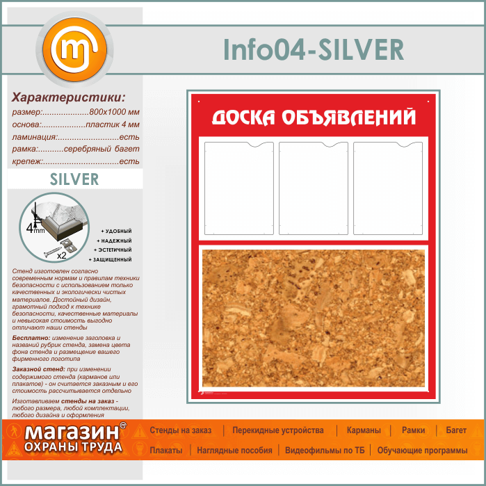 Стенд «Доска объявлений» с пробковым полотном и 3 карманами А4 формата (IN-04-SILVER) в Магнитогорске купить