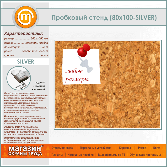 Пробковая доска, 100х80 см (IN-05-SILVER) в Магнитогорске купить
