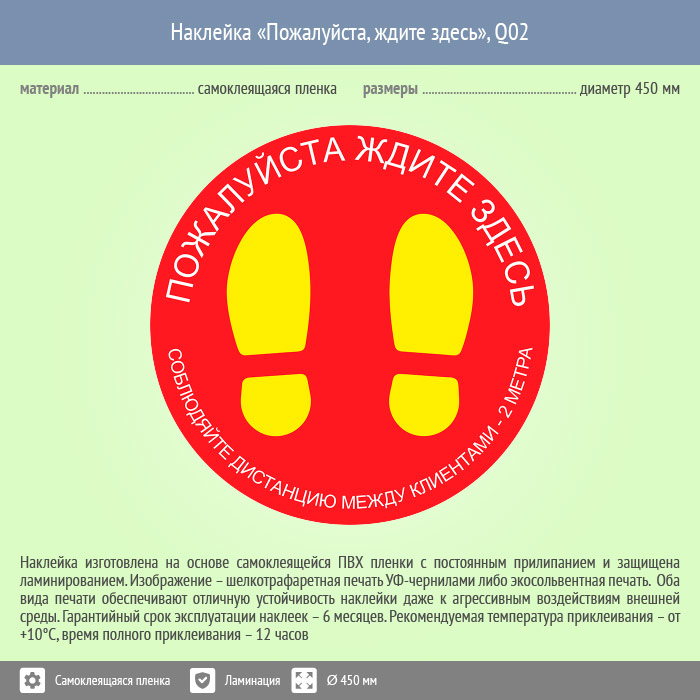 Наклейка на пол «Пожалуйста, ждите здесь», Q02 (пленка c ламинированием, диаметр 450 мм) в Магнитогорске купить
