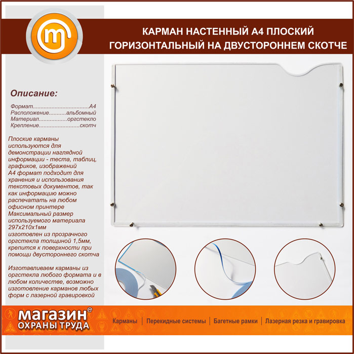 Карман настенный А4 плоский горизонтальный на двустороннем скотче в Магнитогорске купить