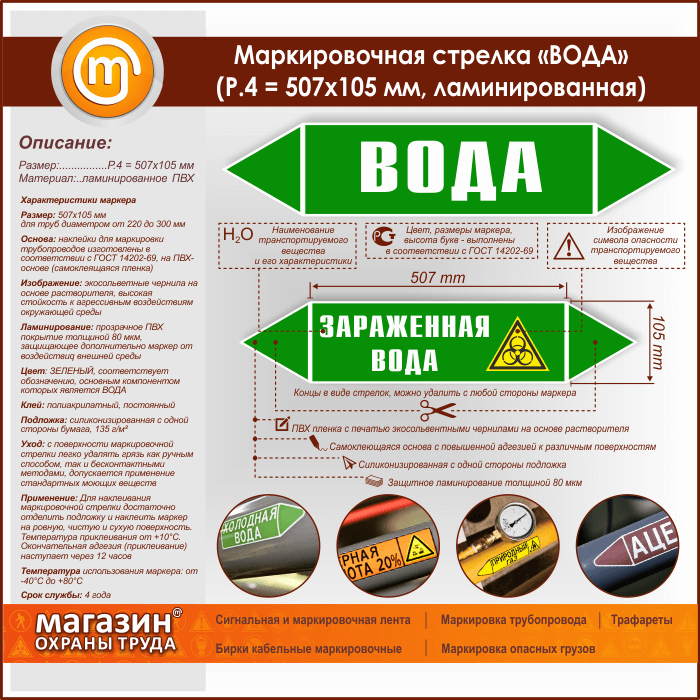 Маркировочная стрелка «ВОДА» (P.4 = 507х105 мм, самоклеящаяся плёнка с ламинированием) в Магнитогорске купить