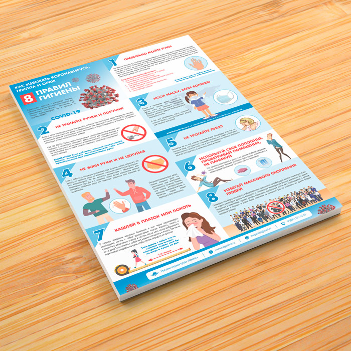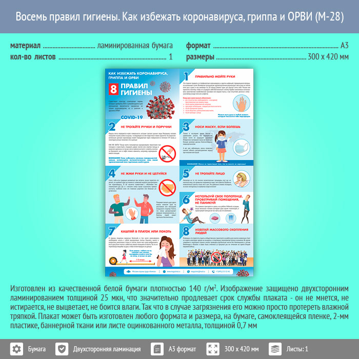 Плакат «Восемь правил гигиены. Как избежать коронавируса, гриппа и ОРВИ» (М-28, ламинированная бумага, А3, 1 лист) в Магнитогорске купить