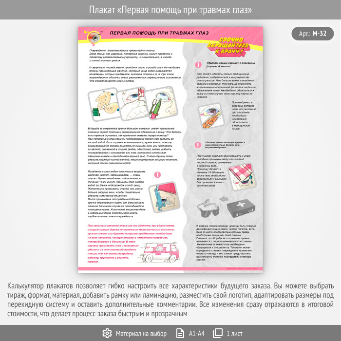 Плакат «Первая помощь при травмах глаз» (М-32, 1 лист) в Магнитогорске купить