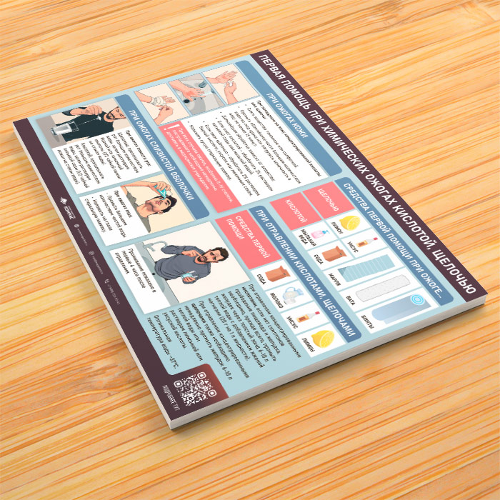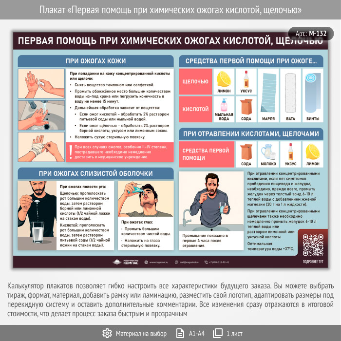 Плакат «Первая помощь при химических ожогах кислотой, щелочью» с QR (М-132, 1 лист) в Магнитогорске купить