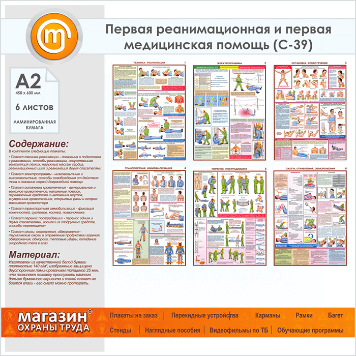 Плакат «Оказание первой помощи пострадавшим» (С-39, ламинированная бумага, А2, 6 листов) в Магнитогорске купить
