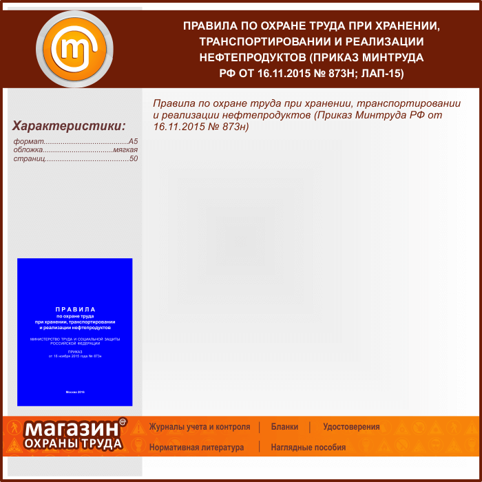 Правила по охране труда при хранении, транспортировании и реализации нефтепродуктов (Приказ Минтруда РФ от 16.11.2015 № 873н) (ЛАП-15) в Магнитогорске купить