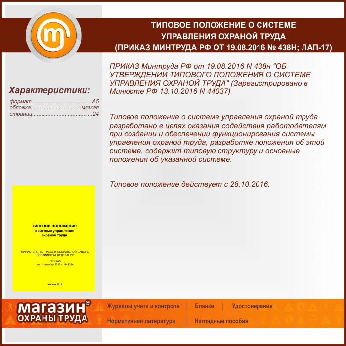 Типовое положение о системе управления охраной труда (Приказ Минтруда РФ от 19.08.2016 № 438н) (ЛАП-17) в Магнитогорске купить