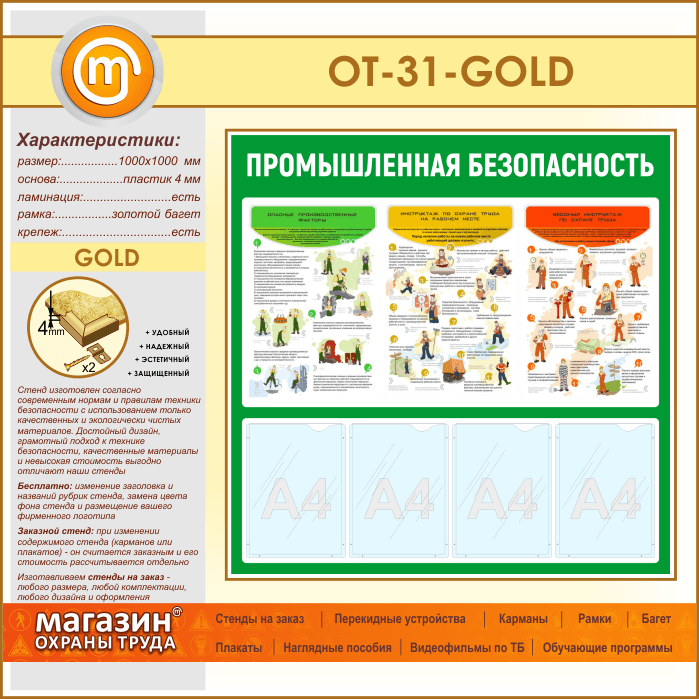 Стенд «Промышленная безопасность» с 4 карманами (OT-31-GOLD) в Магнитогорске купить