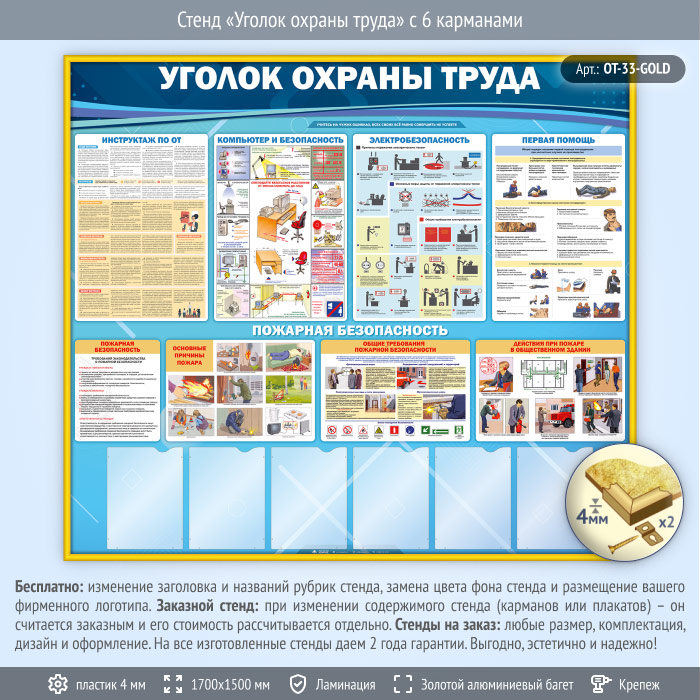 Стенд «Уголок охраны труда» с 6 карманами (OT-33-GOLD) в Магнитогорске купить