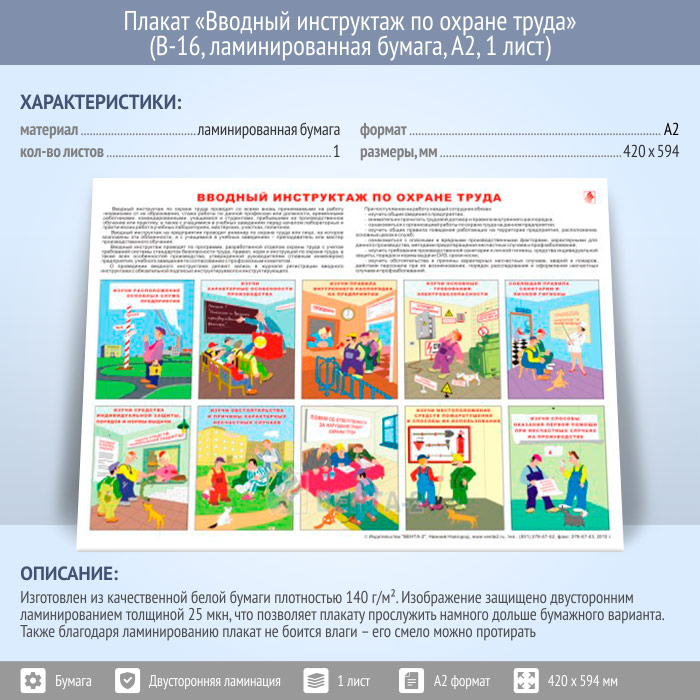 Плакат «Вводный инструктаж по охране труда» (В-16, ламинированная бумага, А2, 1 лист) в Магнитогорске купить