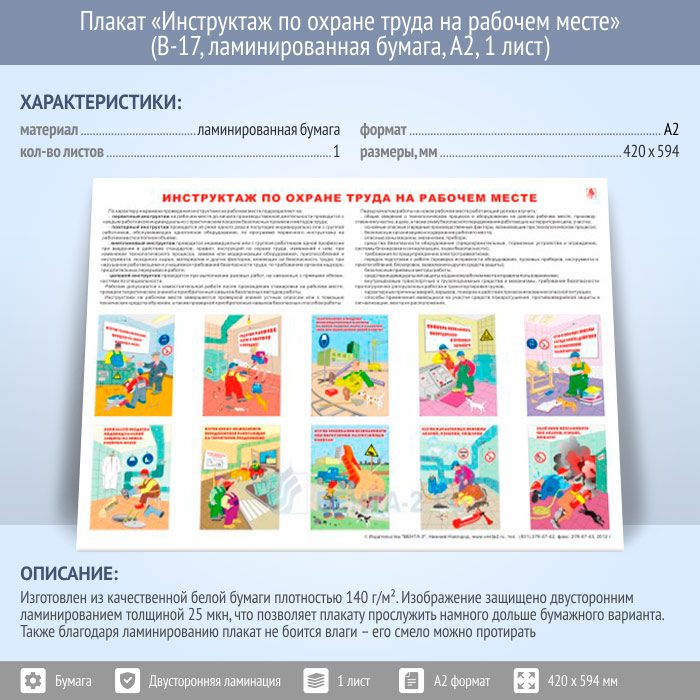 Плакат «Инструктаж по охране труда на рабочем месте» (В-17, ламинированная бумага, А2, 1 лист) в Магнитогорске купить