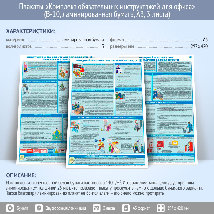 Плакаты «Комплект обязательных инструктажей для офиса» (В-10, ламинированная бумага, А3, 3 листа) в Магнитогорске купить