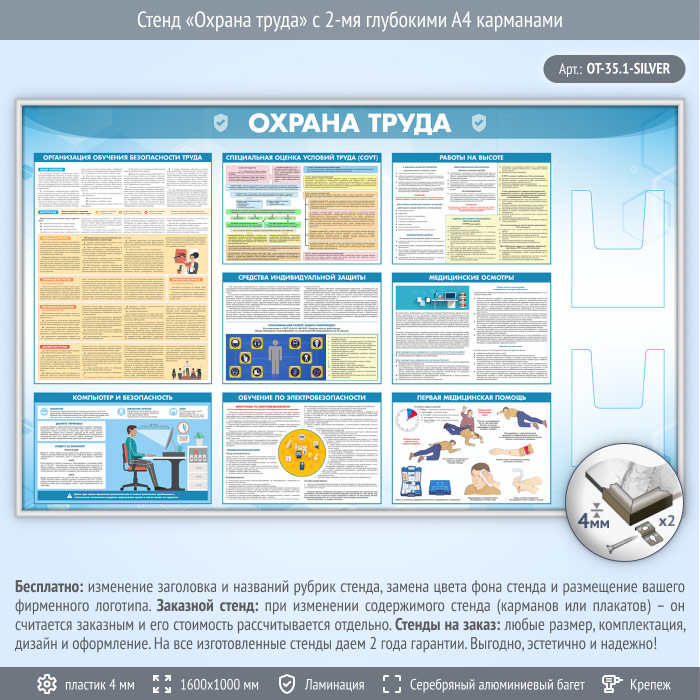 Стенд «Охрана труда» с 2-мя глубокими А4 карманами (OT-35.1-SILVER) в Магнитогорске купить