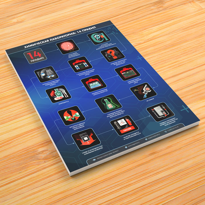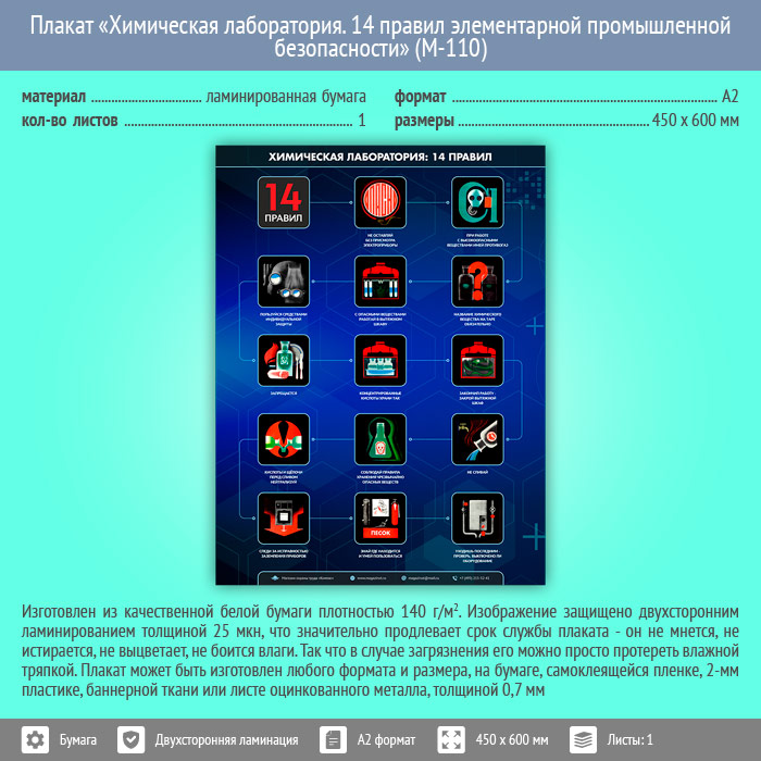 Плакат «Химическая лаборатория. 14 правил элементарной промышленной безопасности» (М-110, ламинированная бумага, А2, 1 лист) в Магнитогорске купить