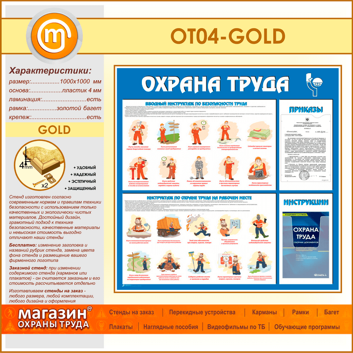 Стенд «Охрана труда» с плоским и объемным карманами (OT-04-GOLD) в Магнитогорске купить